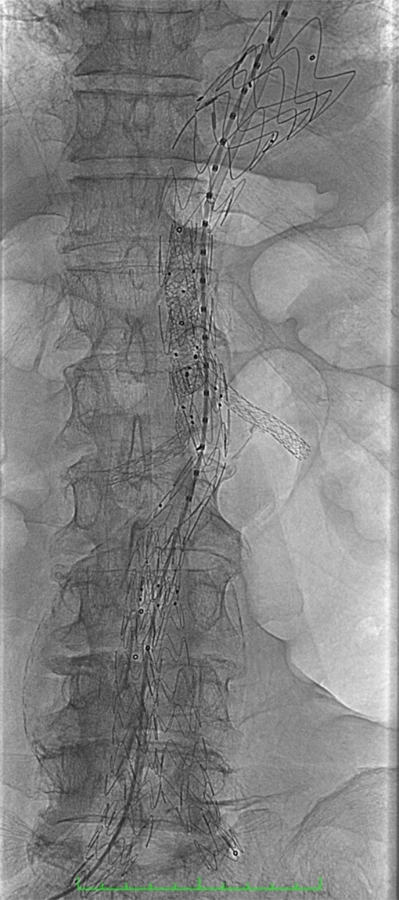 Notably, the successful completion of this complex repair required the integration of endovascular technologies from two different device platforms, combining the Artivion E-xtra Design Multi-branch (EDM) stent graft for visceral branch preservation and the Medtronic Valiant thoracic stent graft system for the staged thoracic repair—demonstrating the importance of cross-platform innovation and collaboration to achieve optimal patient outcomes.