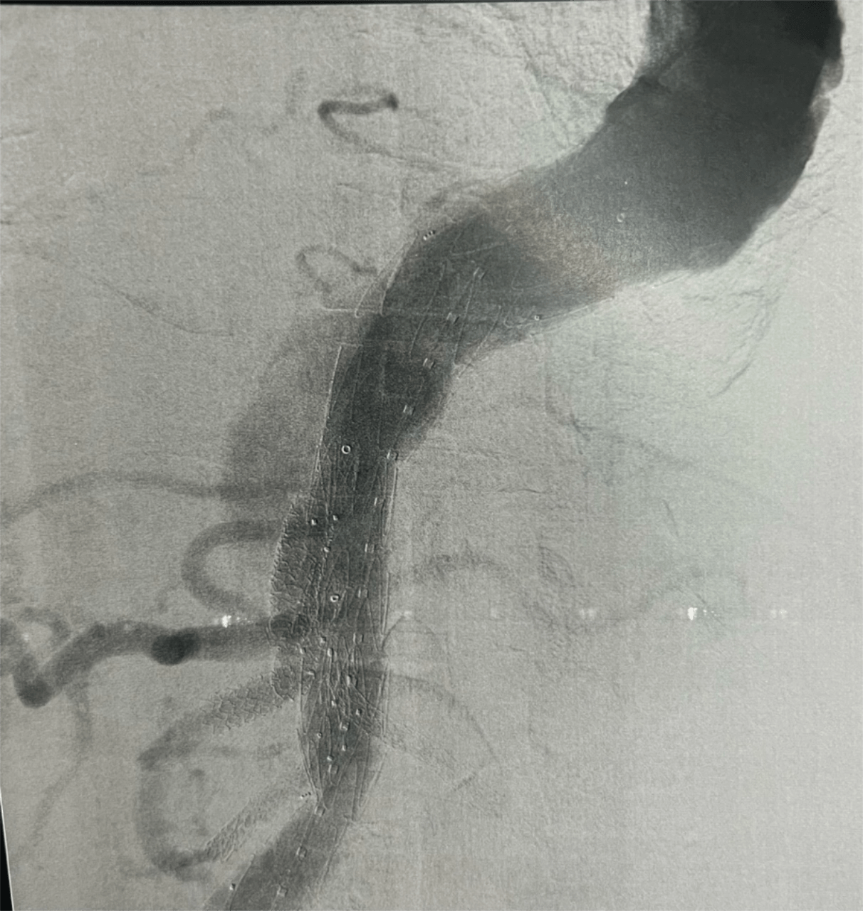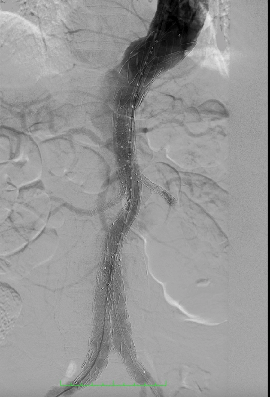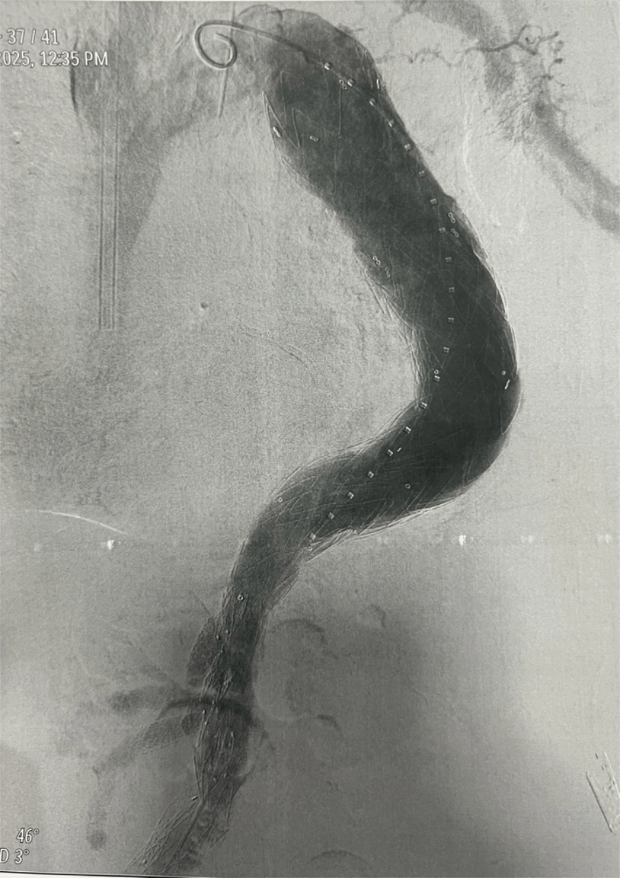 The procedure involved deployment of a custom-made E-xtra Design Multi-branch (EDM) stent graft, with meticulous cannulation and sequential stenting of the visceral arteries via the left brachial approach, including the right renal, left renal, superior mesenteric, and celiac arteries. The iliac limbs were subsequently deployed and optimized with post-dilation.